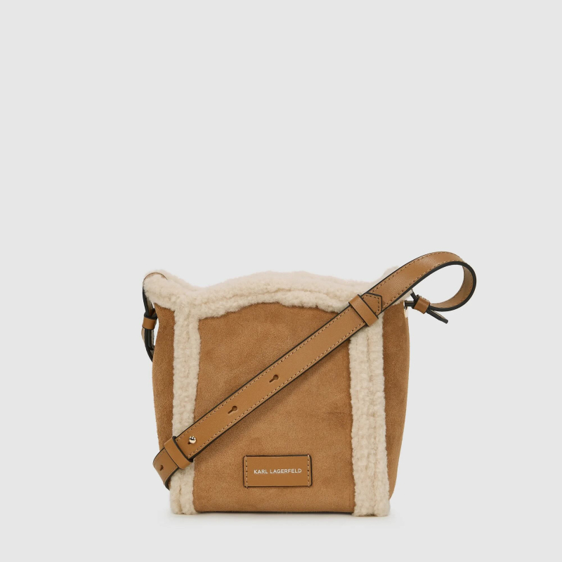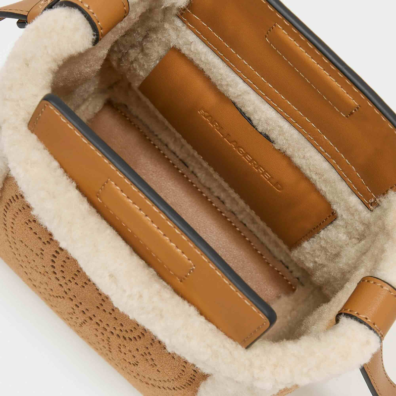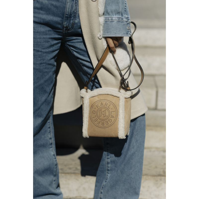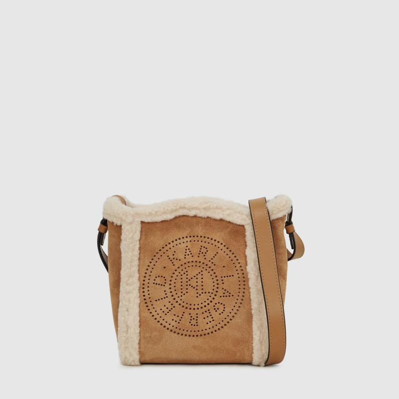 Ce petit sac seau combine du daim doux et une doublure en shearling confortable, orné du logo K/Circle KARL LAGERFELD perforé. Sa fermeture magnétique protège vos essentiels, tandis que la sangle réglable offre un style personnalisé.