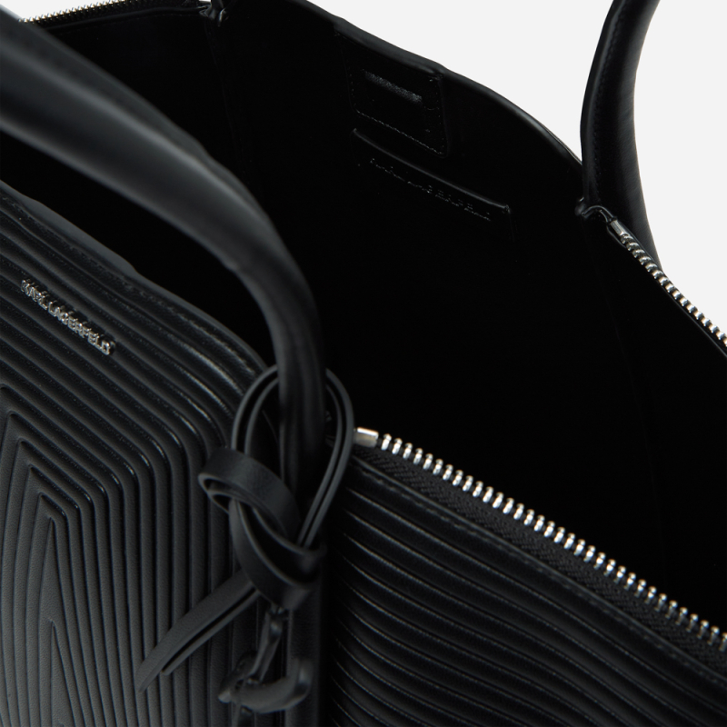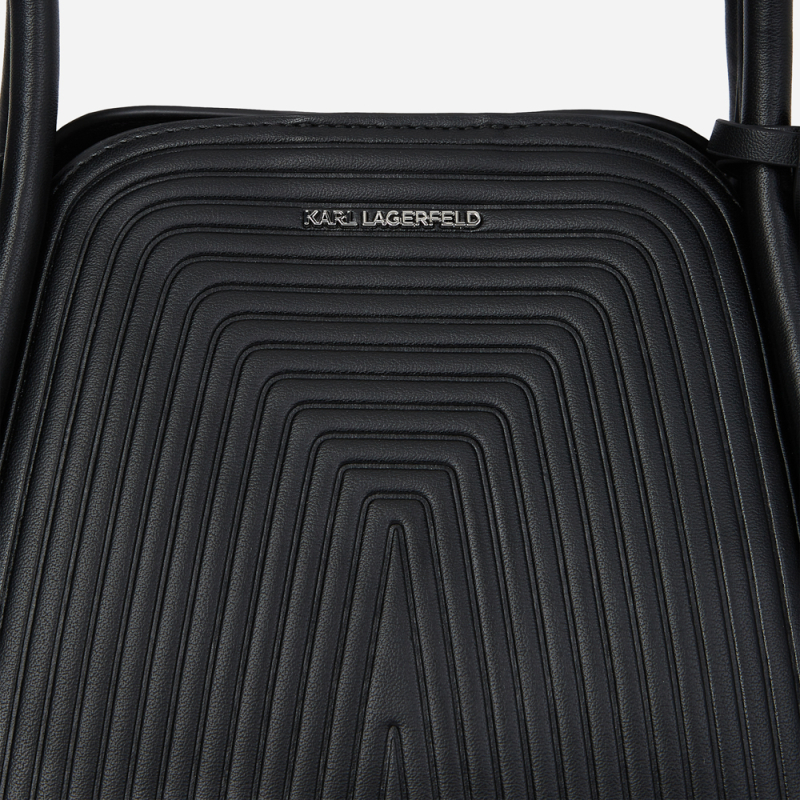 Ce tote bag saisissant KARL LAGERFELD est fabriqué à partir d'un cuir technique à motif en relief, présentant un look distinctif inspiré d'une collection de meubles conçue par Karl Lagerfeld. Doté d'une fermeture magnétique avec des zips latéraux innovants, ainsi que de poignées jumelles sur le dessus et d'une sangle amovible pour une stylisation personnalisable. Une breloque chic Karl Autograph complète cette pièce fonctionnelle mais affirmée.