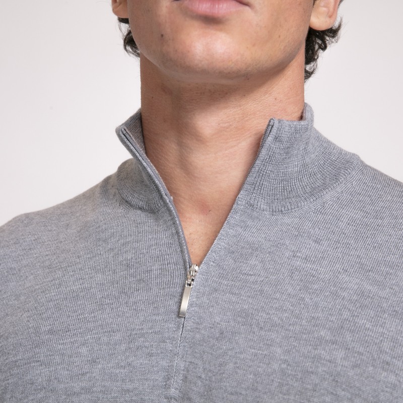 • Pull gris clair à col montant zippé.