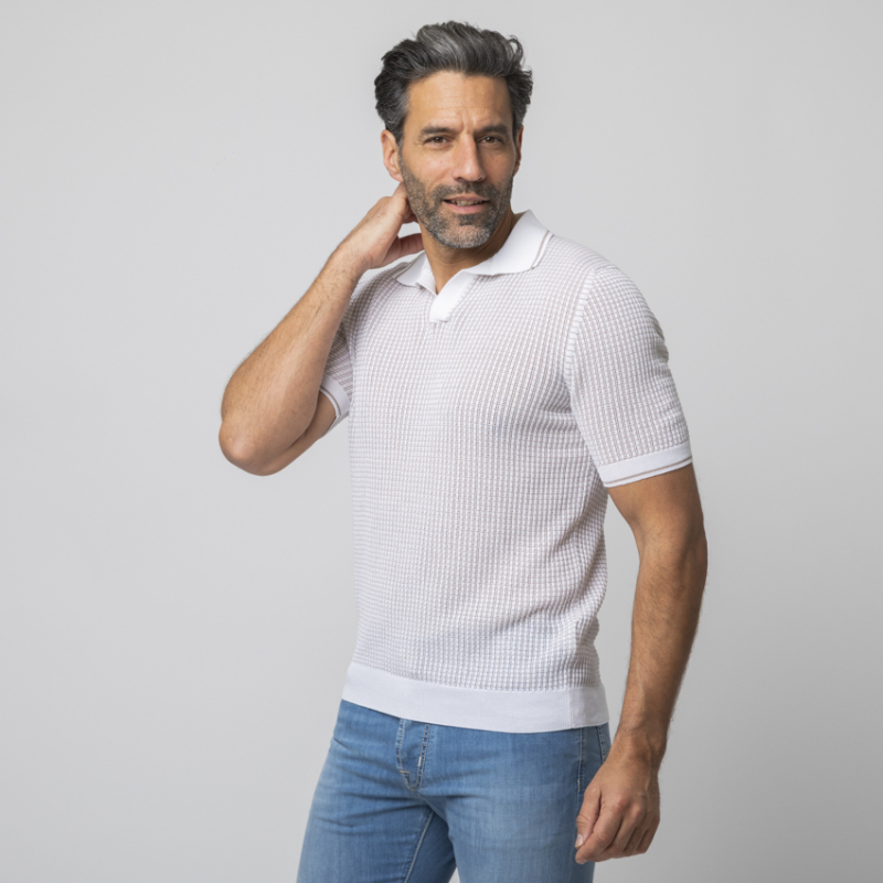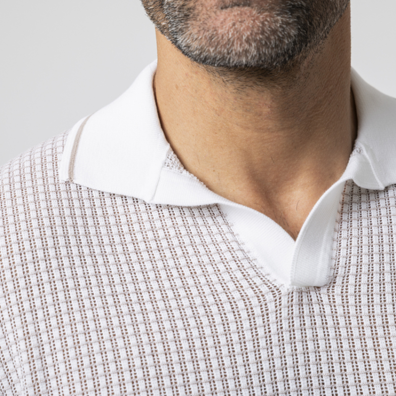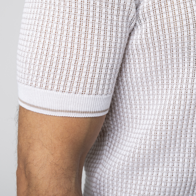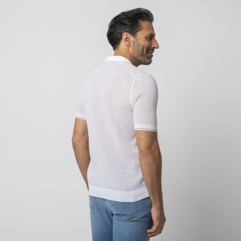 - Polo en maille texturée blanc et beige.