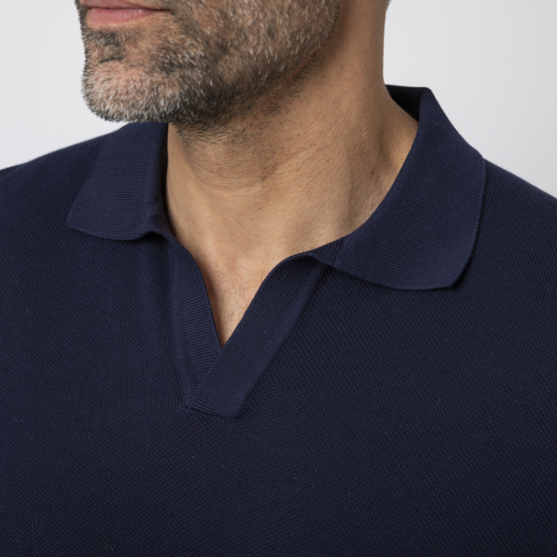 Pur, profond et infiniment raffiné, ce polo bleu marine Gran Sasso sublime les codes du vestiaire masculin. Tricoté dans un luxueux coton piqué crêpe égyptien, il offre une fraîcheur absolue et une respirabilité parfaite pour l'été. Il se distingue par son élégant col skipper ouvert (sans bouton), dégageant le port de tête avec une décontraction maîtrisée. Une pièce minimaliste de luxe irréprochable.
