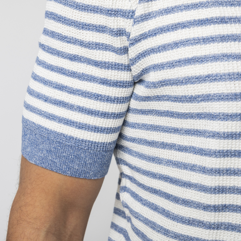 Plongez dans l'esprit de la Riviera avec ce t-shirt rayé signé Gran Sasso. Réinterprétant l'intemporelle marinière à travers le prisme du luxe italien, cette pièce se distingue par une superbe maille texturée en relief. Ce travail de tricotage raffiné, rappelant un point piqué, offre un relief visuel captivant, un toucher luxueux et garantit une excellente respirabilité. Ses rayures bleues légèrement chinées et blanches apportent un dynamisme nautique, souligné par un col rond aux finitions impeccables. L'allié idéal d'un jean brut ou d'un pantalon en lin pour une allure balnéaire résolument sophistiquée.