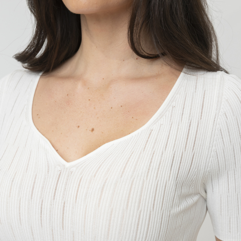 - Encolure féminine plongeante en V festonné.