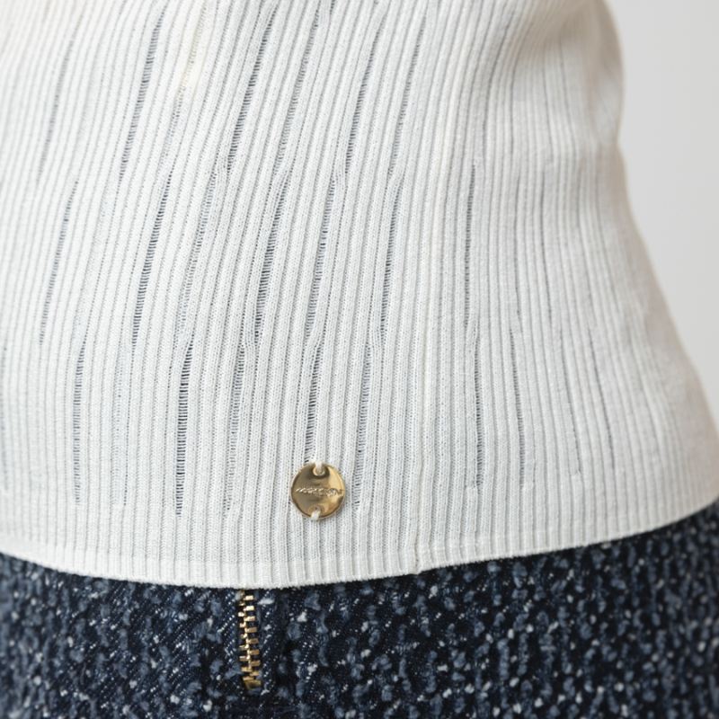 Ce top blanc Marc Cain est l'essence même de l'élégance minimaliste et de la féminité absolue. Confectionné dans une somptueuse viscose stretch finement côtelée d'une douceur remarquable, il épouse et flatte la silhouette avec une précision exquise tout en garantissant une liberté de mouvement totale. Son encolure subtilement échancrée dégage le port de tête avec un raffinement discret. Véritable incontournable du vestiaire, cette pièce lumineuse s'associe aussi bien à un pantalon tailleur structuré qu'à une jupe fluide, offrant une base parfaite pour une allure chic et intemporelle en toute circonstance.