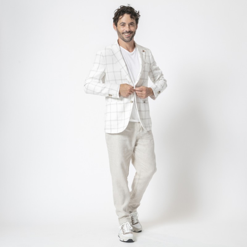 - Veste blanche en lin style blazer à carreaux fenêtre beige et gris.